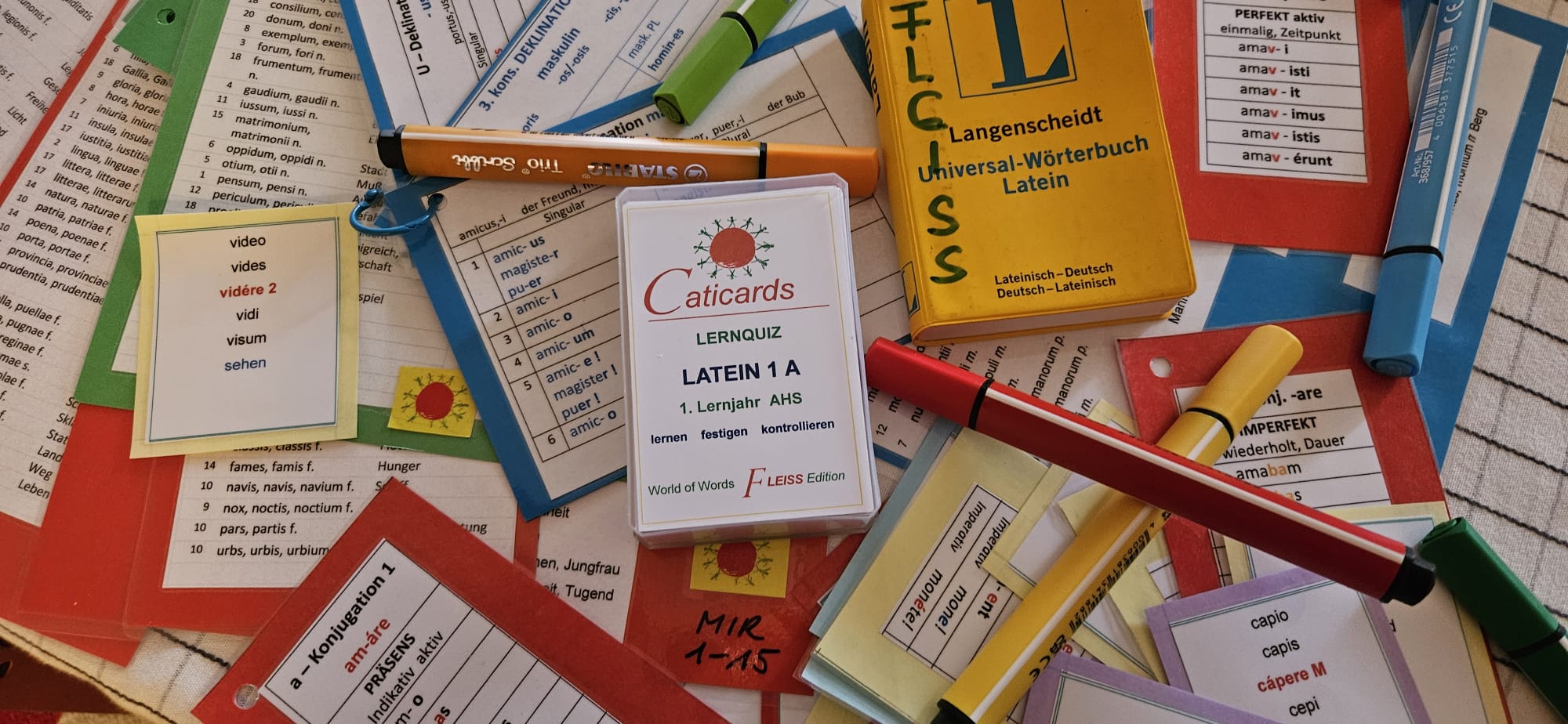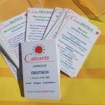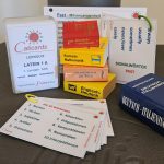 Lernquiz in Englisch, Französisch, Deutsch, Latein, Mathematik - das Schuljahr mit je 100 Caticards in der Hand